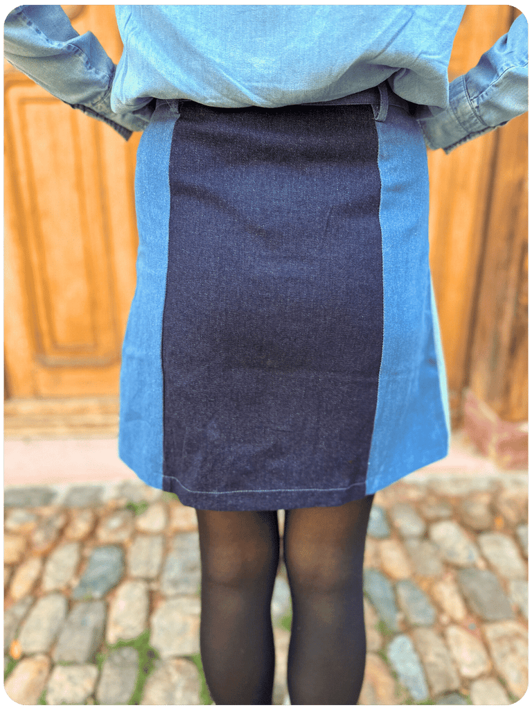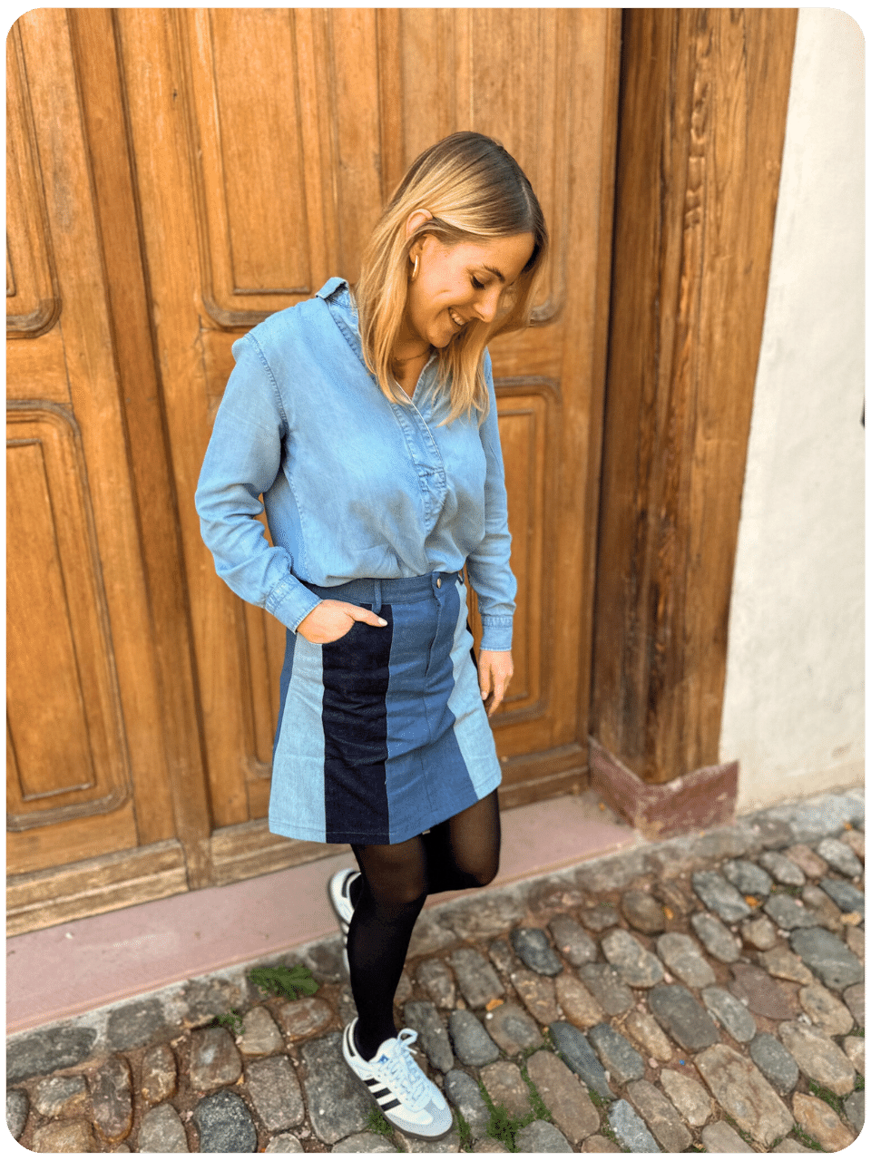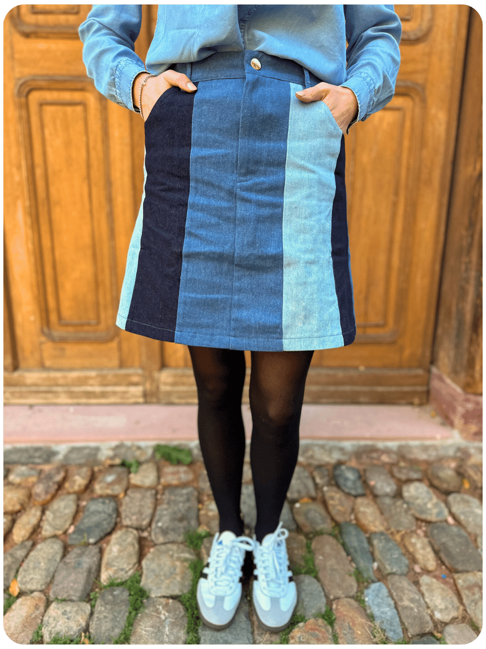La jupe RIGA réalisée en effet denim, s'inspire des années 80 et 90. On adore les différentes couleurs de jeans, so retro! A porter avec un col roulé noir fin ou plus épais pour jouer sur les textures.
